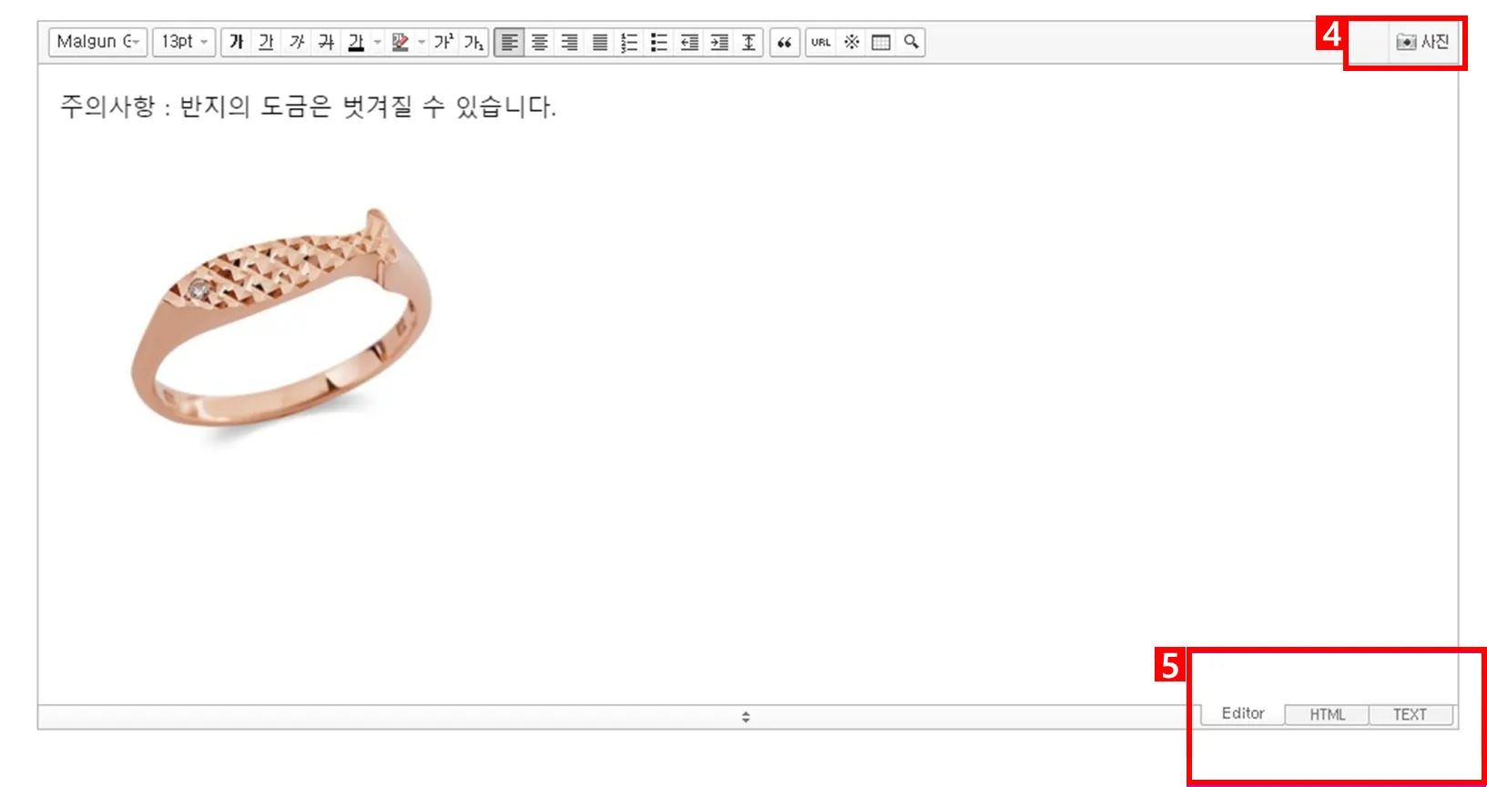 ⑤ 에디터, HTML ,텍스트 모드를 제공합니다.