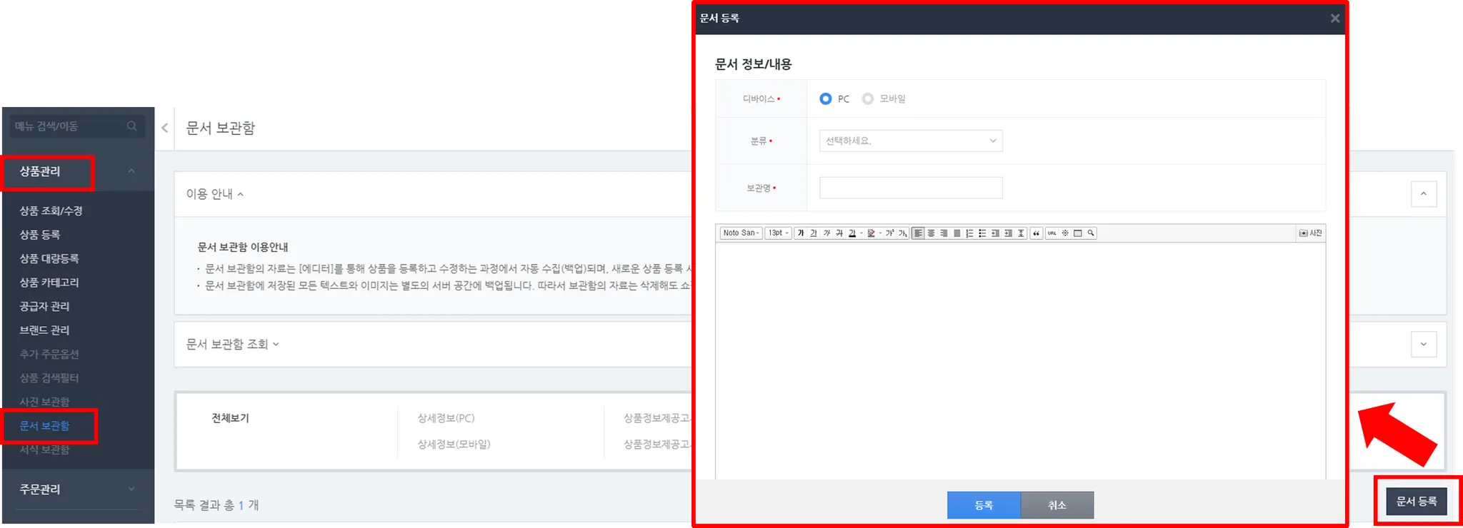 1) [상품관리 > 문서 보관함] 메뉴에서 '문서 등록' 버튼을 클릭하고 '문서 정보/ 내용'을 입력합니다.