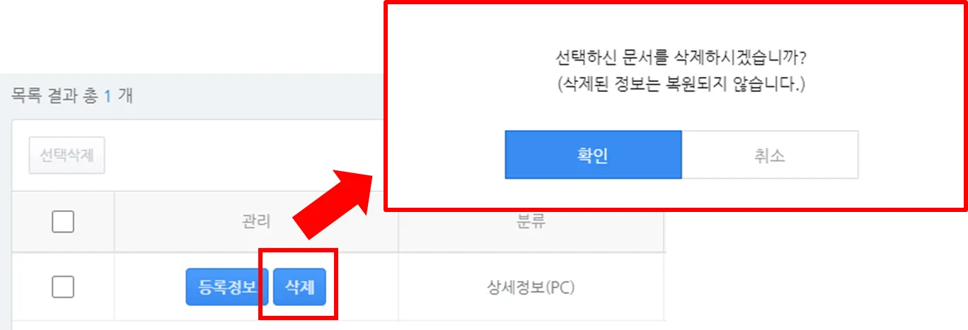 5) 등록된 문서의 ‘삭제’ 버튼을 클릭하면 문서를 삭제할 수 있습니다.