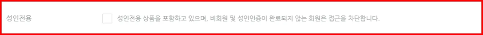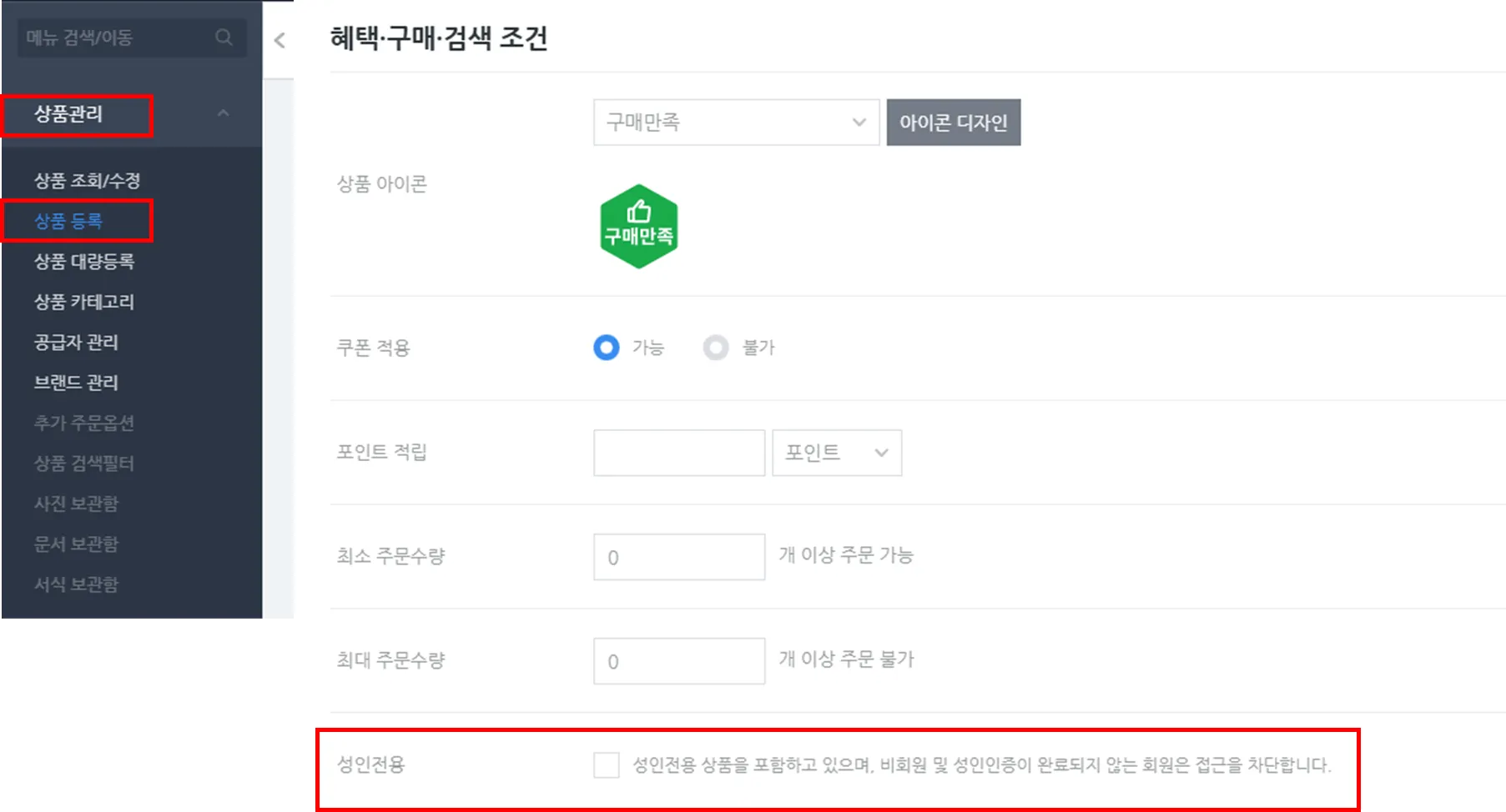 1. 상품 등록/수정 메뉴에서 성인전용 상품을 설정할 수 있습니다.