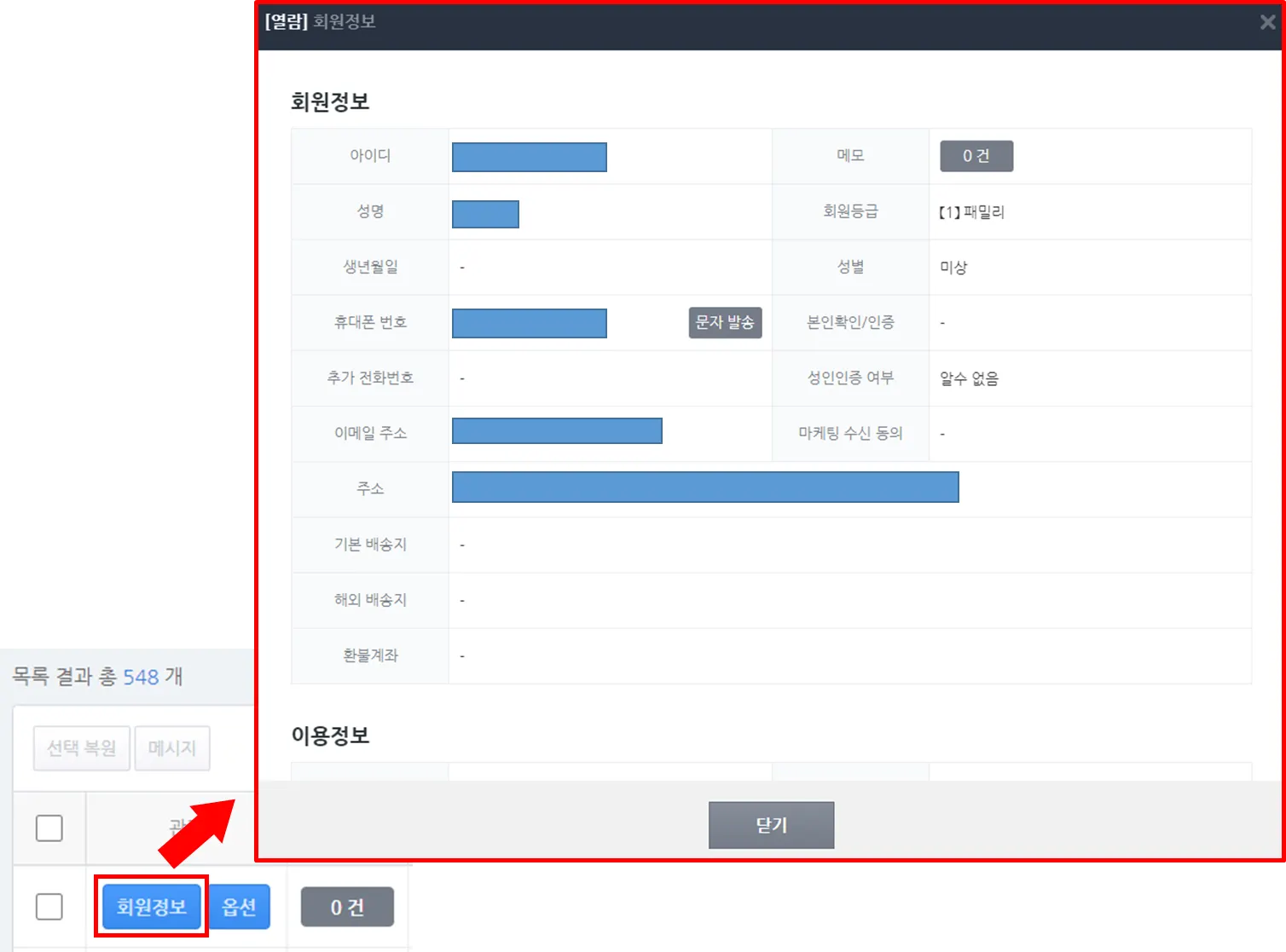 1) 휴면회원 계정의 ‘회원정보’ 메뉴를 클릭하면 회원 상세 정보를 확인할 수 있습니다.